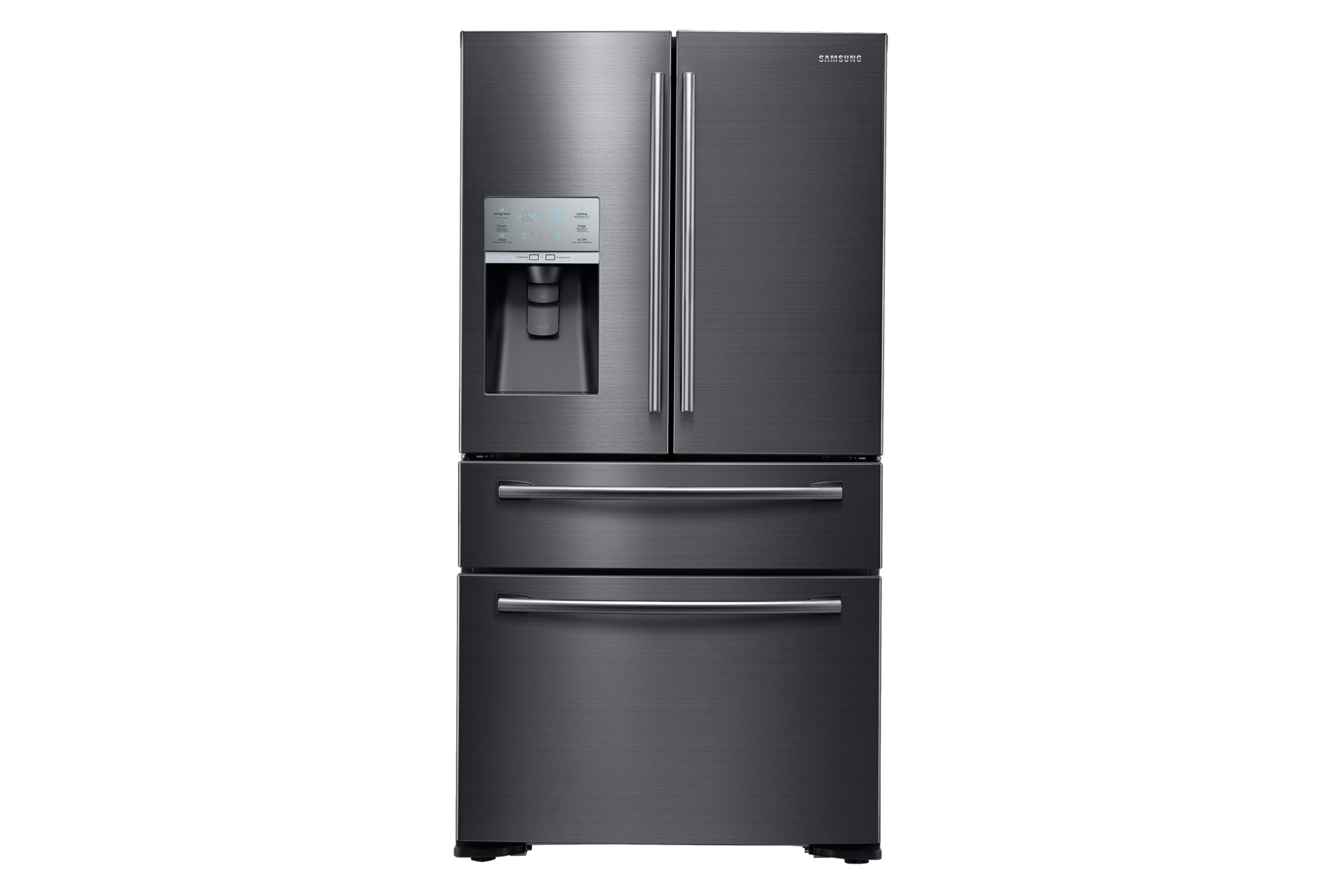 Large capacity 3 door french door refrigerator with family hub and external water ice dispenser stainless steel model.